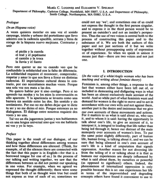 María C. Lugones et Elizabeth V. Spelman, « Have we got a theory for you! Feminist theory, cultural imperialism and the demand for ‘the woman’s voice’ », Women’s Studies Int. Forum, vol. 6, no 6, pp. 573-581, 1983. (extrait en anglais et espagnol)