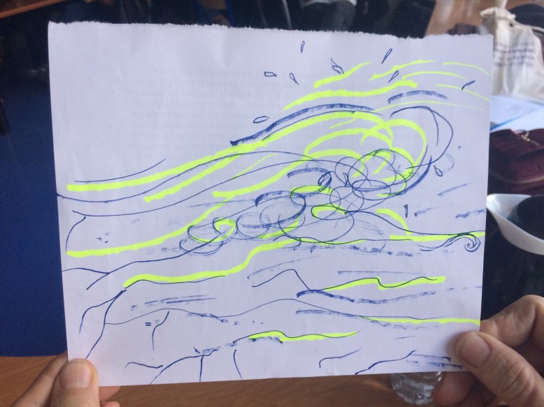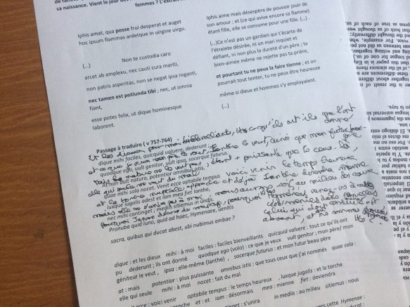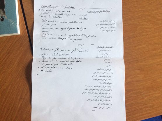Le deuxième exercice était une traduction collective en petits groupes des textes choisis par nos animatrices (Akila, Claire, Heta, Jamie et Ouerdia) en différentes langues : l’arabe, le kabyle, le finnois, le latin, l’espagnol, le français et l’anglais. Deux des textes étaient pré-traduits envers le français et l’anglais respectivement du kabyle et du finnois, deux étaient déjà écrit en deux langues (anglais et espagnol, français et kabyle).