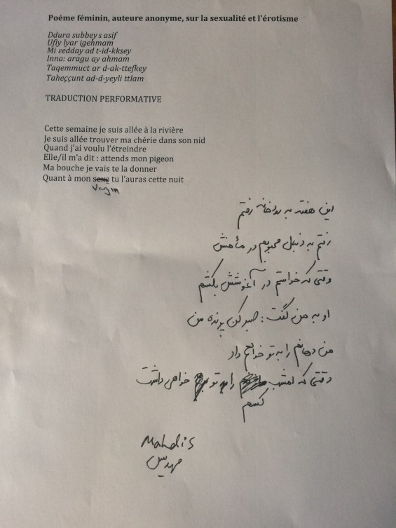 Une des stratégies de résistance lorsqu’on travaille avec la traduction dans une perspective transnationale est d’instrumentaliser les langues “hégémoniques” – ce qui s’est passé pendant l’exercice quand Mahdis a traduit du kabyle envers le persan passant par le français :