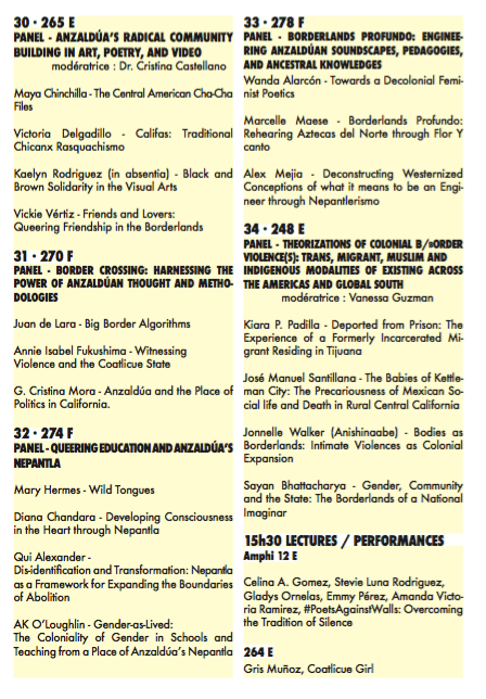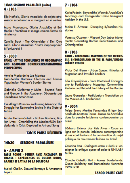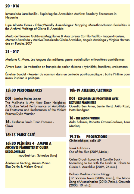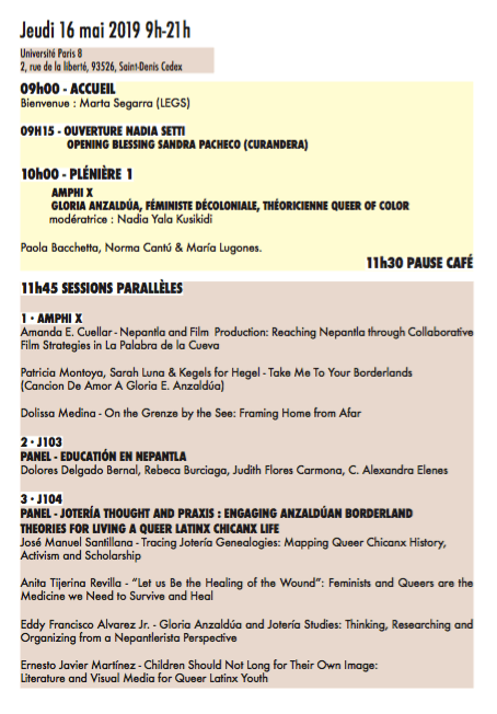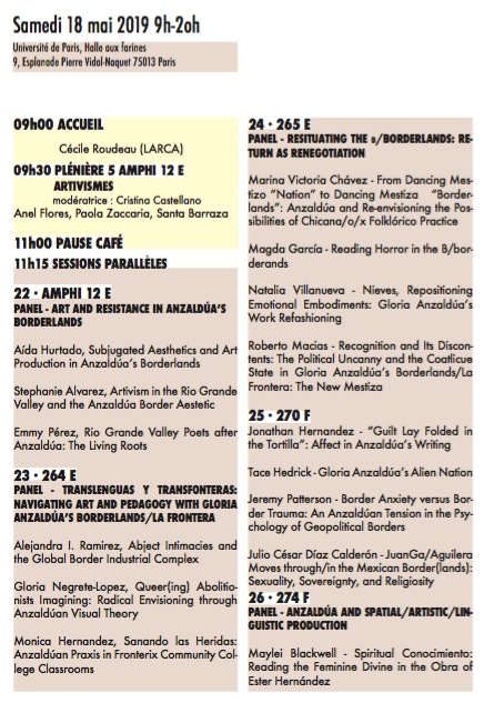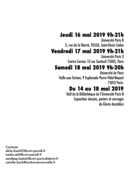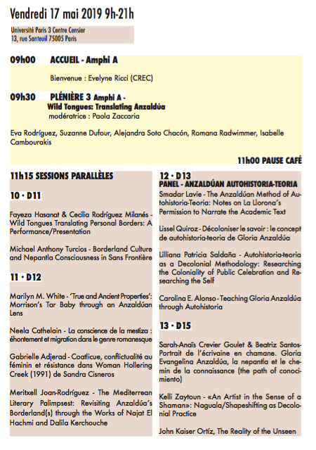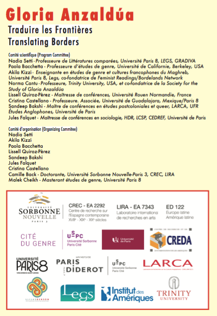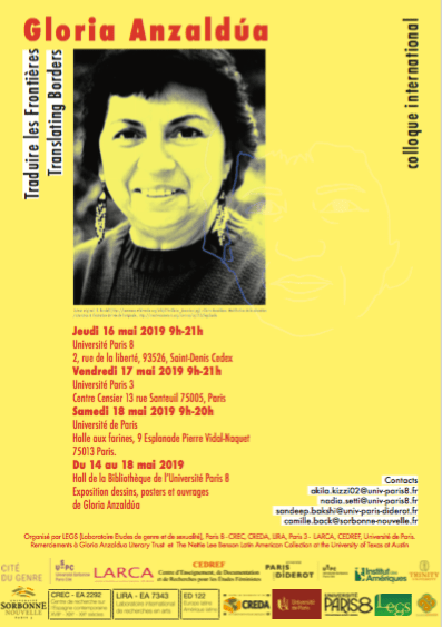 Venez participer à notre atelier de lectures au colloque international Gloria Anzaldúa : Traduire les frontières/Translating Borders, le vendredi 17 mai à 18h (Université Paris 3, salle D01). Et participez à tout le colloque, bien sûr, c’est amazing! Du 16 au 18 mai, plein de communications, discussions, conférences, ateliers, performances, une exposition à Paris 8 du 14 au 18 mai… Ci-joint le programme mis à jour avec une nouvelle affiche, à bientôt !