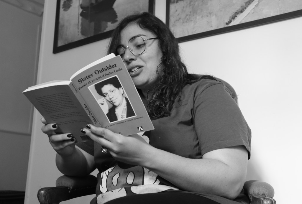 Figure 2: Kamila Bouchemal lisant Audre Lorde, Sister Outsider, Mamamelis (2018) / ©Salima Amari