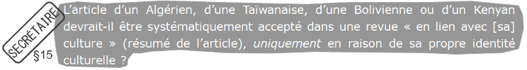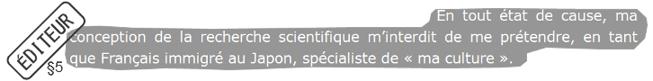 Je n’ai jamais prétendu être « spécialiste de “ma culture” », proposition qui d’ailleurs frôle l’absurde. L’éditeur me prend visiblement pour son reflet en se mettant à ma place, mais c’est impossible. Pour cela, il faudrait qu’il écrive un article en japonais pour une revue scientifique japonaise se situant à Paris et se donnant pour rôle de statuer sur les études françaises. Dans un tel contexte imaginaire, s’il assiste à des activités de nature équivalentes à ce que je décris, alors soit il témoigne courageusement des dissymétries qu’il rencontre, soit il choisit de rester dans une position de soumission à l’arbitraire d’un·e autre.