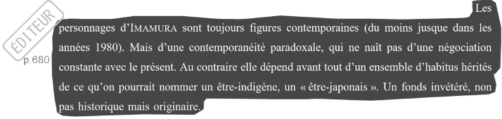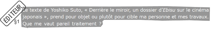 Un nouvel exemple de mésusage des citations, dans le passage cité, je ne parle pas des études japonaises en langue française. Dans mon texte, ce sont les spectateur·rices de cinéma en général qui sont surplombant·es face à un film. Et c’est l’expérience cinématographique d’un seul individu, l’éditeur, qui se renforce dans le voyeurisme et dans la domination. Bien naturellement, je reconnais les autres comme sujets de parole. Pour ma part, je n’ai jamais cherché à effacer leurs propos, mais j’ai néanmoins le droit de pointer les nombreux procédés utilisés par ces paroles.
