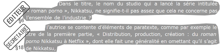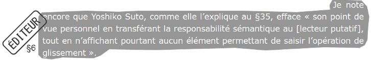 L’on peut remarquer un procédé relevant à nouveau du miroir. En changeant le sujet d’une phrase de mon texte, l’éditeur retourne mon propos pour me faire dire (« comme elle l’explique ») ce qu’il me reproche, ou plus exactement l’analyse qui lui était adressée. Ce procédé pourrait sembler équivalent à une formule enfantine du type « c’est celui qui dit qui est ». Mais aussi, le remplacement de « réalisateur japonais » par « [lecteur putatif] », produit un second détournement suscitant une émotion aux lecteur·rice afin qu’iels se sentent concerné·es.