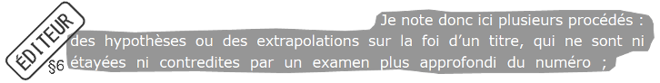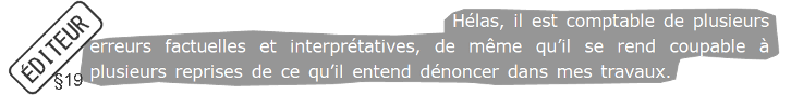 La secrétaire cite une phrase de mon texte en ajoutant un sujet grammatical qui n’existe pas dans la source. En effet, je ne parlais aucunement de la revue en général, mais d’un fonctionnement circonscrit et d’un questionnement plus abstrait portant sur les champs scientifiques. Je note néanmoins que la disputatio scientifique a bien eu lieu dans une autre revue (Itinéraires) et que les arguments relèvent davantage d’une disputatio rhétorique produisant un brouillage plutôt que de l’établissement d’une clarté.