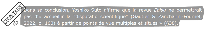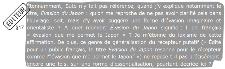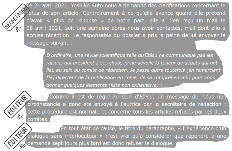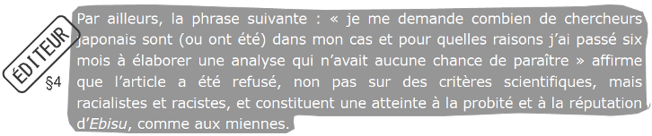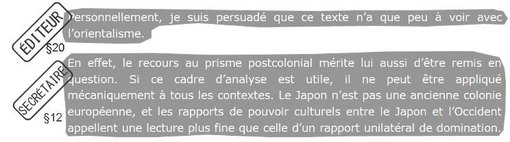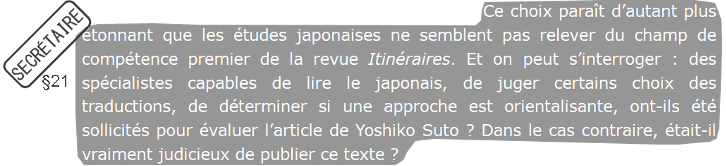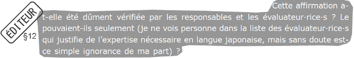 L’éditeur suppose que les évaluateur·rices n’ont pas les compétences requises en langue japonaise. Étant donné qu’il est impossible de se procurer la liste exhaustive des évaluateur·rices, cette question ouverte ne peut obtenir de réponse et vise à produire un doute auprès des lecteur·rices. Personnellement je peux affirmer que la procédure d’évaluation scientifique de la revue Itinéraires a été fort sérieuse avec des expertises précises, pertinentes et constructives. Quoi qu’il en soit, l’extériorité est souhaitable, ne serait-ce que pour obtenir des points de vue qui permettent de ne pas sombrer dans un discours autoréférencé et autolégitimé n’ayant plus de rapport avec l’évolution des épistémologies et de la société.