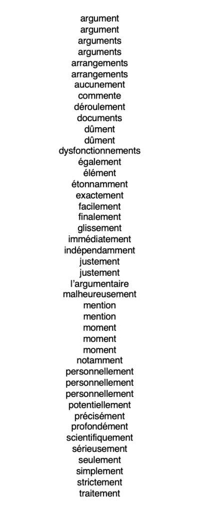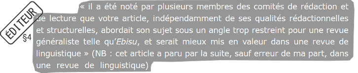 Le premier passage est l’extrait du mail que j’ai obtenu et qui frôle l’absurde. Ma proposition (suite à l’appel à proposition) stipulait qu’il s’agissait d’une analyse linguistique et a été acceptée en l’état (en tout cas c’est ce que je croyais). Au final, l’article a été rejeté à cause de sa spécialité. Pris de la sorte, l’idée d’une revue scientifique généraliste est totalement arbitraire. En effet, il n’existe pas de discipline de la généralité, n’importe quel article peut alors être rejeté le moment opportun comme trop spécialisé. Par ailleurs, j’ai fait paraître un article qui reprend certains éléments, mais pas l’ensemble des points abordés. La parution ultérieure de cet article devient, par l’éditeur, un argument validant la catégorie non généraliste permettant le refus d’un texte antérieur dont la proposition avait pourtant été acceptée.