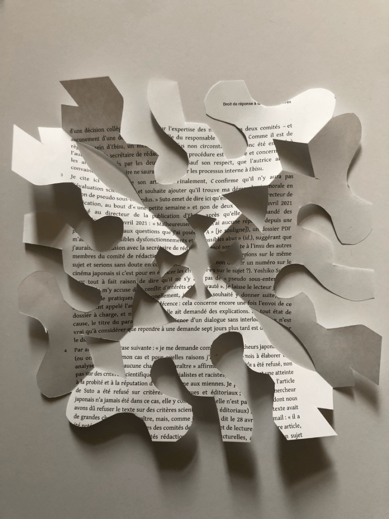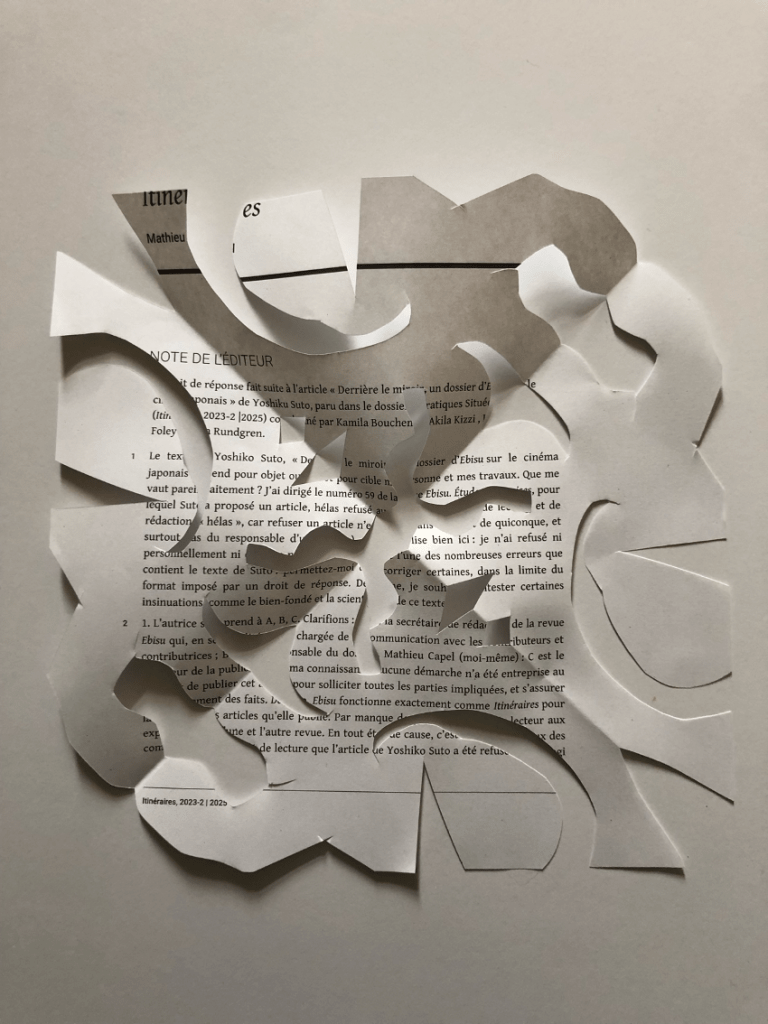 En 2024, nous avons publié un numéro de la revue Itinéraires, “Pratiques situées”, consacré à une « critique-en-action des modes de production universitaire », où nous avons voulu questionner la manière dont on étudie et écrit dans les sciences humaines et sociales, les approches, les expressions et les méthodes de transmission des savoirs. Après la publication du numéro, nous avons reçu un courriel de la part d’une personne (appelée dans ce qui suit « l’éditeur ») dont les idées ont été critiquées dans l’article d’une de nos contributrices, Yoshiko Suto. Ce courriel accusait Yoshiko Suto ainsi que nous les éditrices des “Pratiques situées” de diffamation et demandait le retrait de l’article. Les services juridiques de deux universités consultées ont tranché la question : il ne s’agit pas d’une diffamation mais d’un débat d’idées. En connaissance de cette réalité judiciaire, « l’éditeur » ainsi que « la secrétaire » (d’une revue dont le fonctionnement est analysé dans l’article de Suto) ont rédigé deux réponses qui se trouvent actuellement dans la section varia des “Pratiques situées”.