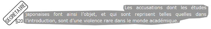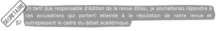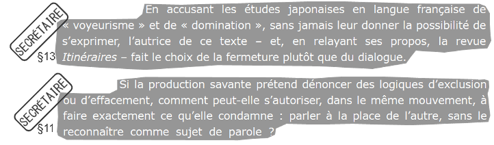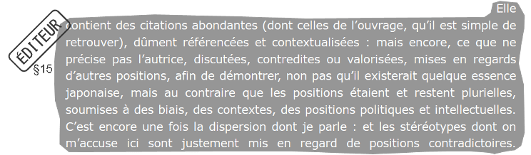 Je n’ai jamais prétendu être « spécialiste de “ma culture” », proposition qui d’ailleurs frôle l’absurde. L’éditeur me prend visiblement pour son reflet en se mettant à ma place, mais c’est impossible. Pour cela, il faudrait qu’il écrive un article en japonais pour une revue scientifique japonaise se situant à Paris et se donnant pour rôle de statuer sur les études françaises. Dans un tel contexte imaginaire, s’il assiste à des activités de nature équivalentes à ce que je décris, alors soit il témoigne courageusement des dissymétries qu’il rencontre, soit il choisit de rester dans une position de soumission à l’arbitraire d’un·e autre.