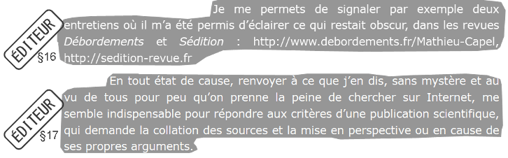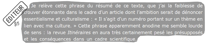 Certains éléments sont extraits d’un échange privé avec la direction dans lequel je posais des questions sur des éléments factuels. La manière dont ils sont retranscrits décontextualise et instrumentalise mon propos. L’utilisation du verbe « suggér[er] » par l’éditeur montre bien qu’il s’agit d’une (sur)interprétation de sa part, fiction dans laquelle je deviens un double imaginaire visiblement en concurrence. Effectivement, l’éditeur n’a pas souhaité donner suite, en effet lui et la secrétaire ont même proposé (entre le refus du premier article et la parution de l’article sur Itinéraires), par l’intermédiaire d’un proche, de travailler ensemble à l’avenir. L’utilisation de discussion privée est un argument à double tranchant, tout dépend du choix des situations mises en exergue. Ce type de spéculation privée n’a à mon sens rien à faire dans un débat scientifique.