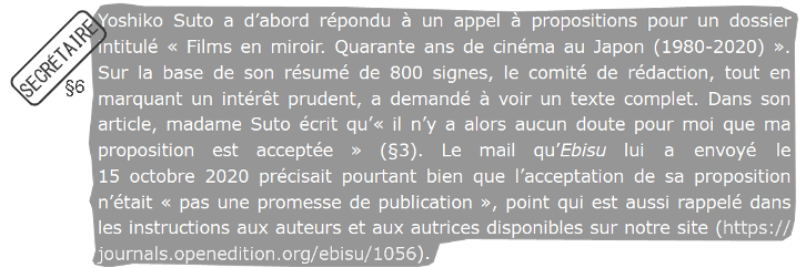 L’éditeur se donne un statut de victime avec une rhétorique à visée émotionnelle. Or mon article n’est pas une vengeance, il se situe dans la droite ligne de celui que j’avais proposé à la revue de japonologie et de nombreuses parutions récentes. J’analyse souvent dans mes publications comment des représentations d’un champ esthétique peuvent être transfigurées par des acteur·rices dans un processus qualifiable d’internationalisation. En l’occurrence, j’ai effectivement trouvé une matière conséquente avec des occurrences répétées, et je ne me suis même pas penchée sur l’ensemble des traductions menées par l’éditeur sur des propos de cinéastes. En revanche, supposer sans aucune preuve que ma démarche consiste en une forme de vengeance vient rajouter quelques a priori supplémentaires sur ma supposée émotionalité de Japonaise.